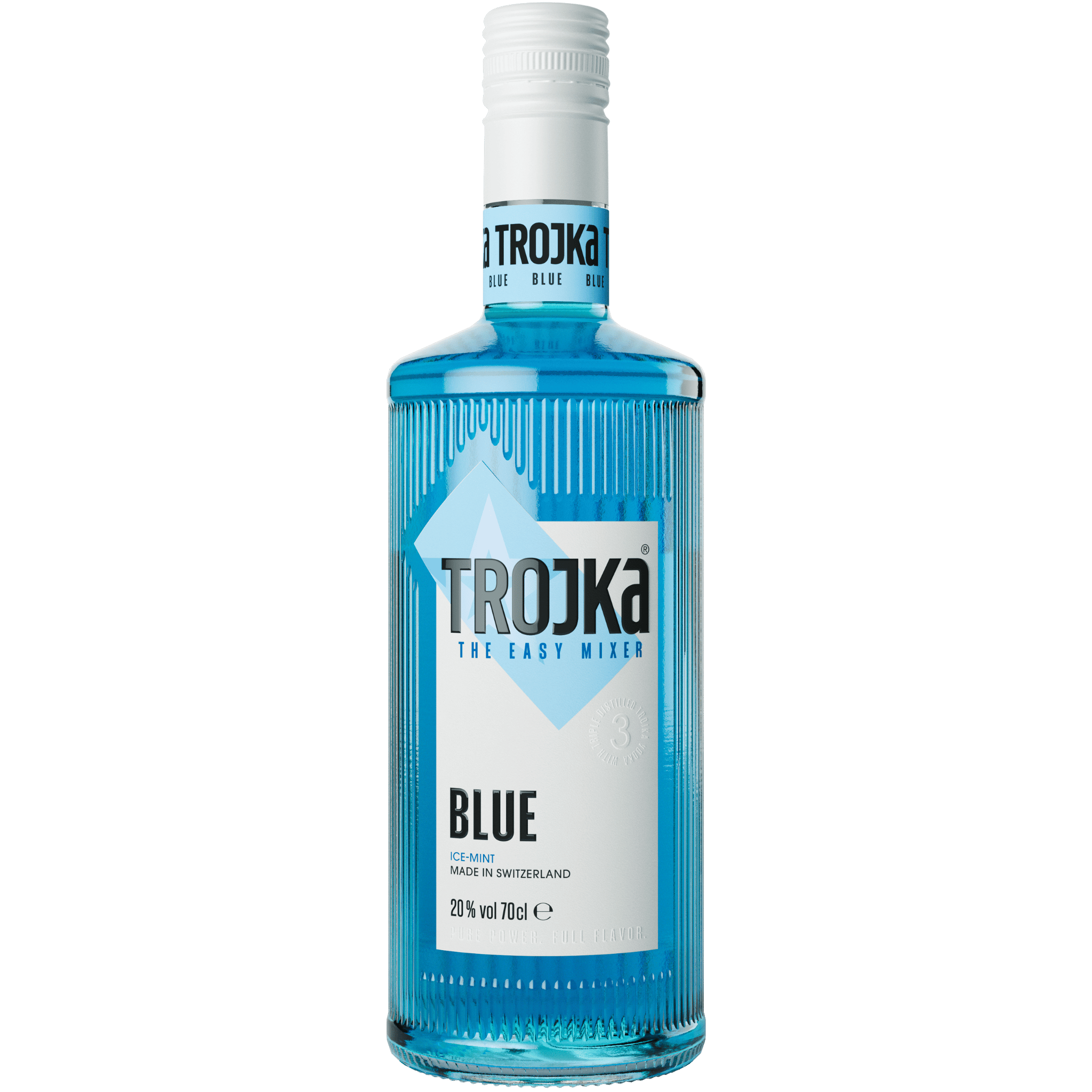 Trojka Blue: Der blaue Vodka-Likör aus der Schweiz, der mit seinem coolen Ice Mint-Geschmack für einen Hauch von Extrafrische sorgt und zugleich einen Farbtupfer in ausgefallene Longdrinks und kreative Cocktails bringt. Die Herstellung besteht aus der Basis von Trojka Vodka und extra frischem Ice Mint Geschmack. Produziert wird der Trojka Vodka Likör Blue in der Schweiz in der DIWISA Distillerie Willisau und seit 2021 zusätzlich komplett klimaneutral dank der Partnerschaft mit ClimatePartner.